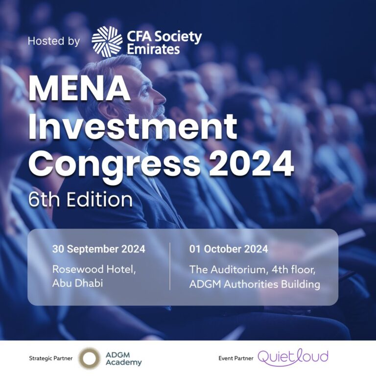 Abu Dhabi, UAE – The 6th edition of MENA Investment Congress (MENA ICON), hosted by the CFA Society Emirates, will return to the Abu Dhabi Global Market (ADGM) on September 30 and October 1, 2024. Recognized as one of the most exclusive financial events in the region, MENA ICON is set to gather the leading minds in finance, investments, and policy-making for two days filled with insightful and thought-provoking discussions on the most pressing issues that are shaping the global and regional financial landscape.