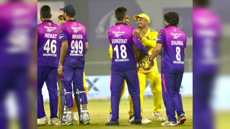 Dubai: In a tightly contested match, the Sahgal Delhi Demons edged out the Ghaziabad Bhawani Tigers by 4 wickets in a low-scoring affair. Winning the toss, the Tigers elected to bat first but struggled to build momentum. Early on, they lost their captain Hitesh Sharma to a brilliant delivery from Abhishek Sakuja in the 3rd over. Peter Trego top-scored for the Tigers with a valuable 34 runs off 24 balls, while Zeeshan Mewati chipped in with a late flourish, remaining unbeaten on 23 off 12 balls. The Tigers managed to set a modest total of 144/8 after their 20 overs.