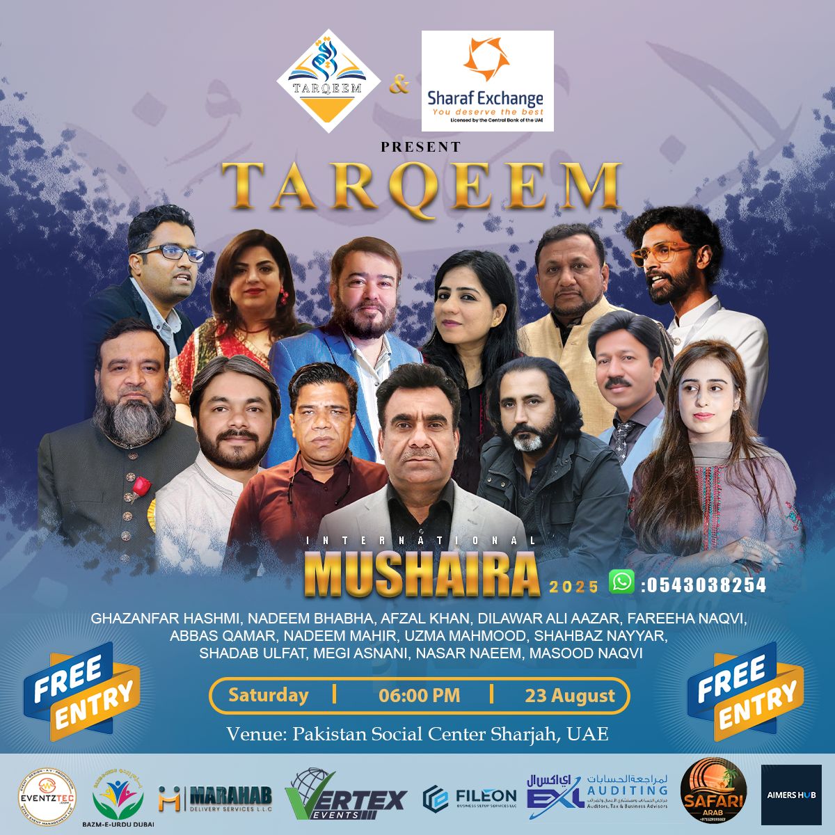 The TAROEEM International Mushaira 2025 is organized by TARQEEM andSharaf Exchange, a licensed money exchange service with a strong presence in the UAE. The event aims to promote cultural exchange and appreciation of Urdu poetry, providing a platform for poets to share their work with a diverse audience.